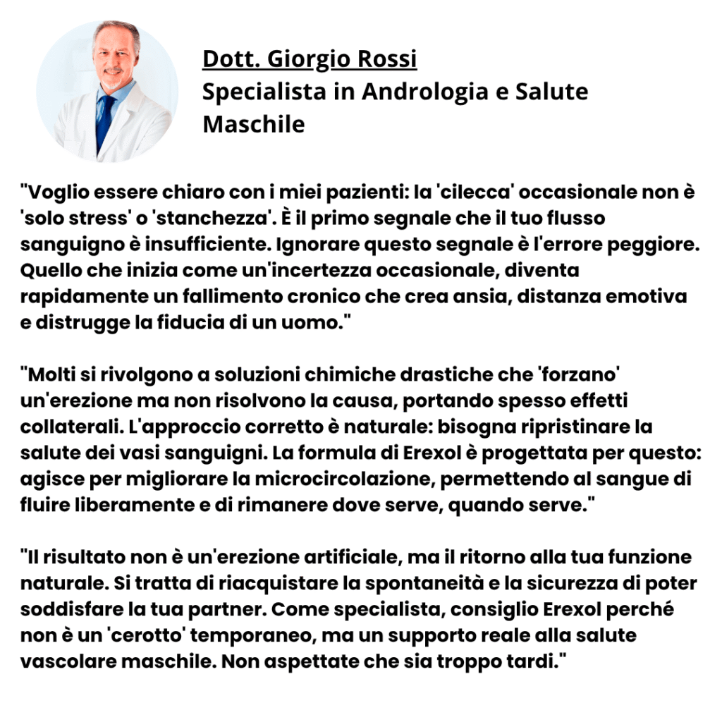 Il segreto di Erexol risiede nella sua formula avanzata, ricca di composti clinicamente testati che ripristinano la tua virilità e potenziano le tue prestazioni.